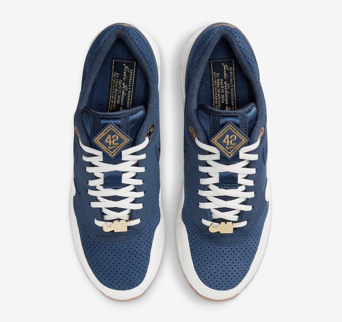 La Nike Air Max 1 ’86 « Jackie Robinson » se distingue par son design soigné et ses détails significatifs. La palette de couleurs s’inspire des Dodgers de Brooklyn, l’équipe pour laquelle Robinson a joué, avec des nuances de bleu, de blanc et de rouge. Des éléments distinctifs comme le numéro « 42 » de Robinson, sa signature et des citations inspirantes ajoutent une touche personnelle et historique à la sneaker.